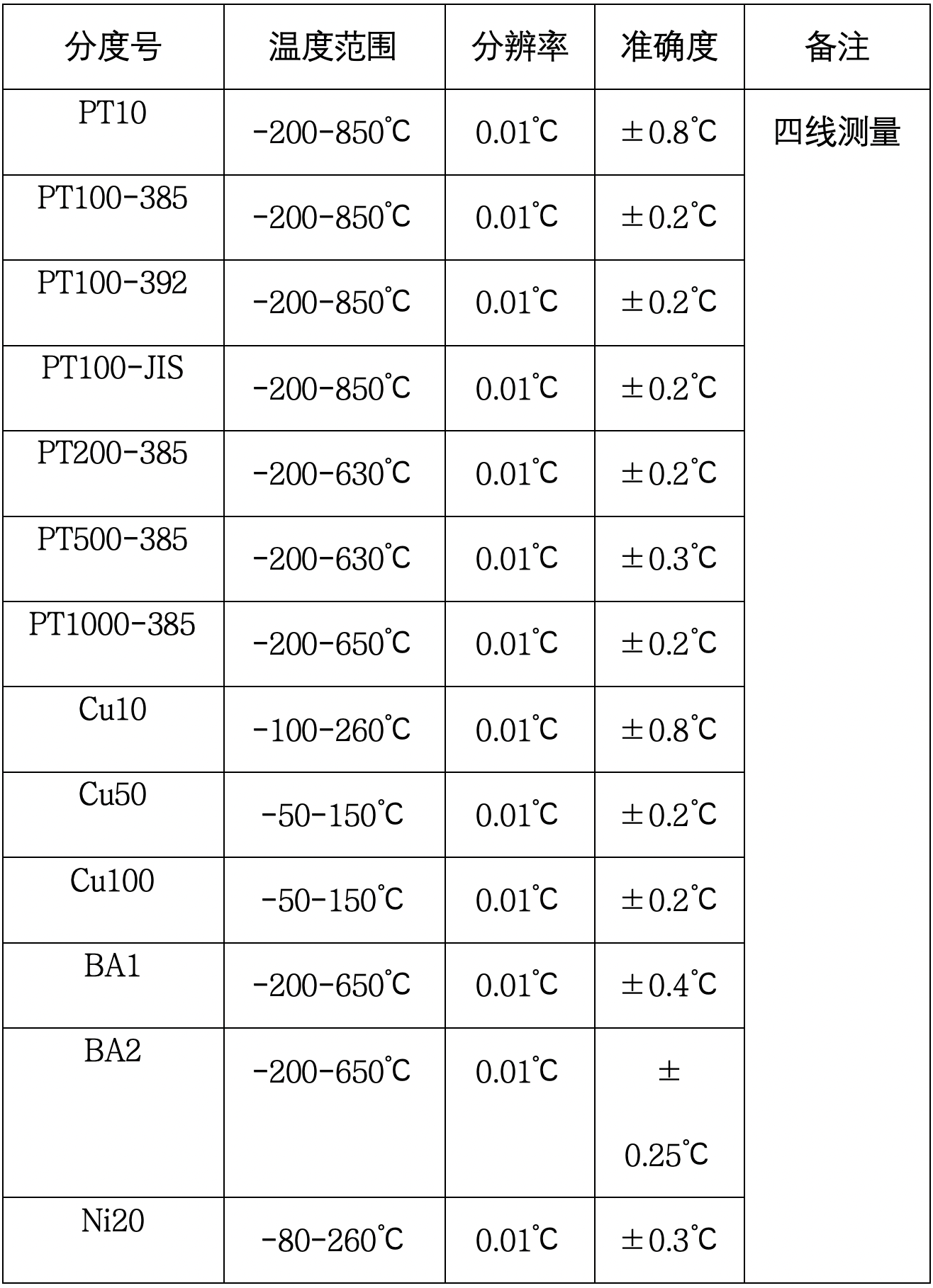 l 热电阻种类:PT100-385,PT100-392,PT100-JIS,PT200-385,PT500-385,PT1000-385,